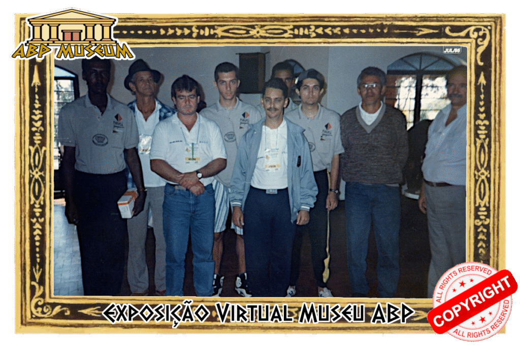 Jogos Regionais de 1994 em Ourinhos. Equipe de Parapuã (P), 6ª colocada com damistas da equipe de Assis (A), vice campeã. E>>D: Hélio Albino (P), José Melo (A), Martinez Molina (A), Luciano Canalis (P), Joir Silva (A), Altemir Silva (P), Sidnei Souza (P), Jauro Brito (A) e William Bucco (árbitro).
