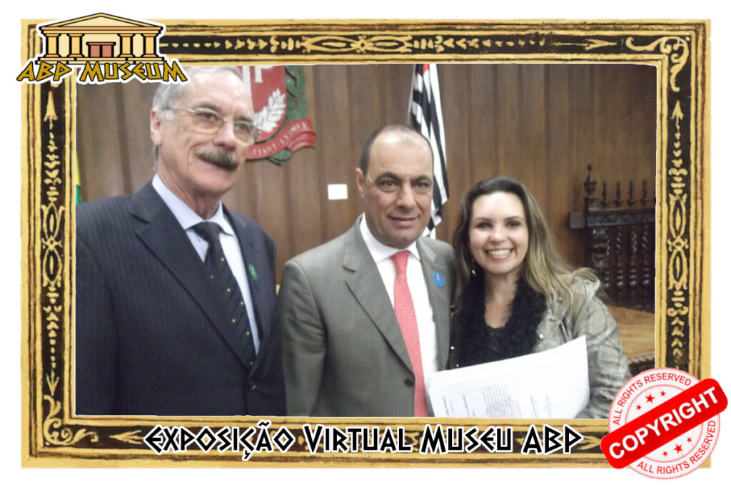 Dr.a Paula Crudi (D), representando a ABP, em solenidade no Palácio dos Bandeirantes, recebendo das mãos do secretário estadual de esporte, Sr. José Auricchio Junior (C) documentação e certificado de projeto aprovado pela Lei Paulista de Incentivo ao Esporte.